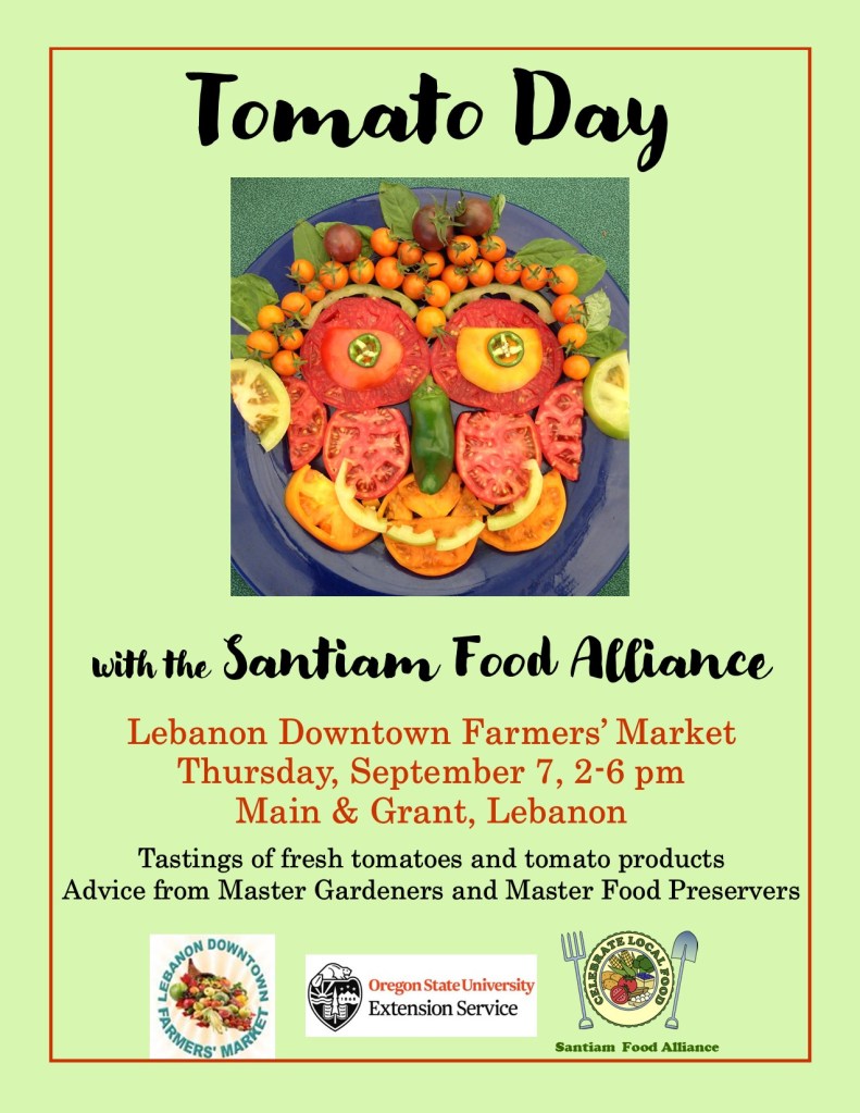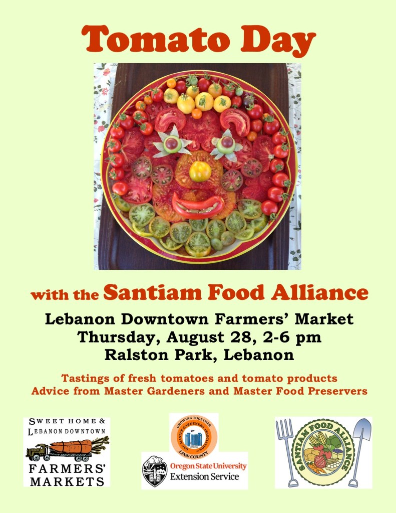 The Lebanon Downtown Farmers’ Market and the Santiam Food Alliance invite you to admire, taste, and stock up on tomatoes at the market on Tomato Day, Thursday, August 29. Throughout the market hours of 2 to 6 p.m., we’ll offer tastings of dozens of unusual and often beautiful tomato varieties from the market farmers and our own gardens. An Oregon State University Extension Master Food Preserver will offer information on drying and canning tomatoes, a Master Gardener will provide advice on growing them, and volunteers will offer free samples of tomato-based foods.